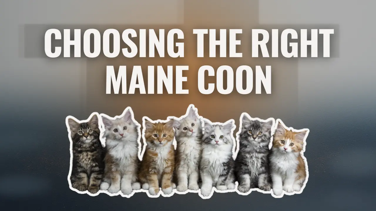 Choosing the right Maine Coon with a lineup of Maine Coon kittens pictured below text